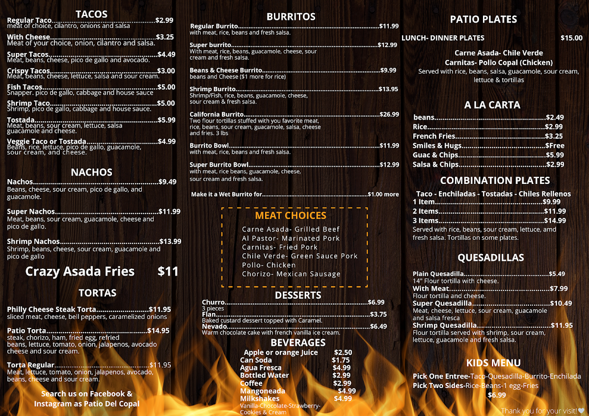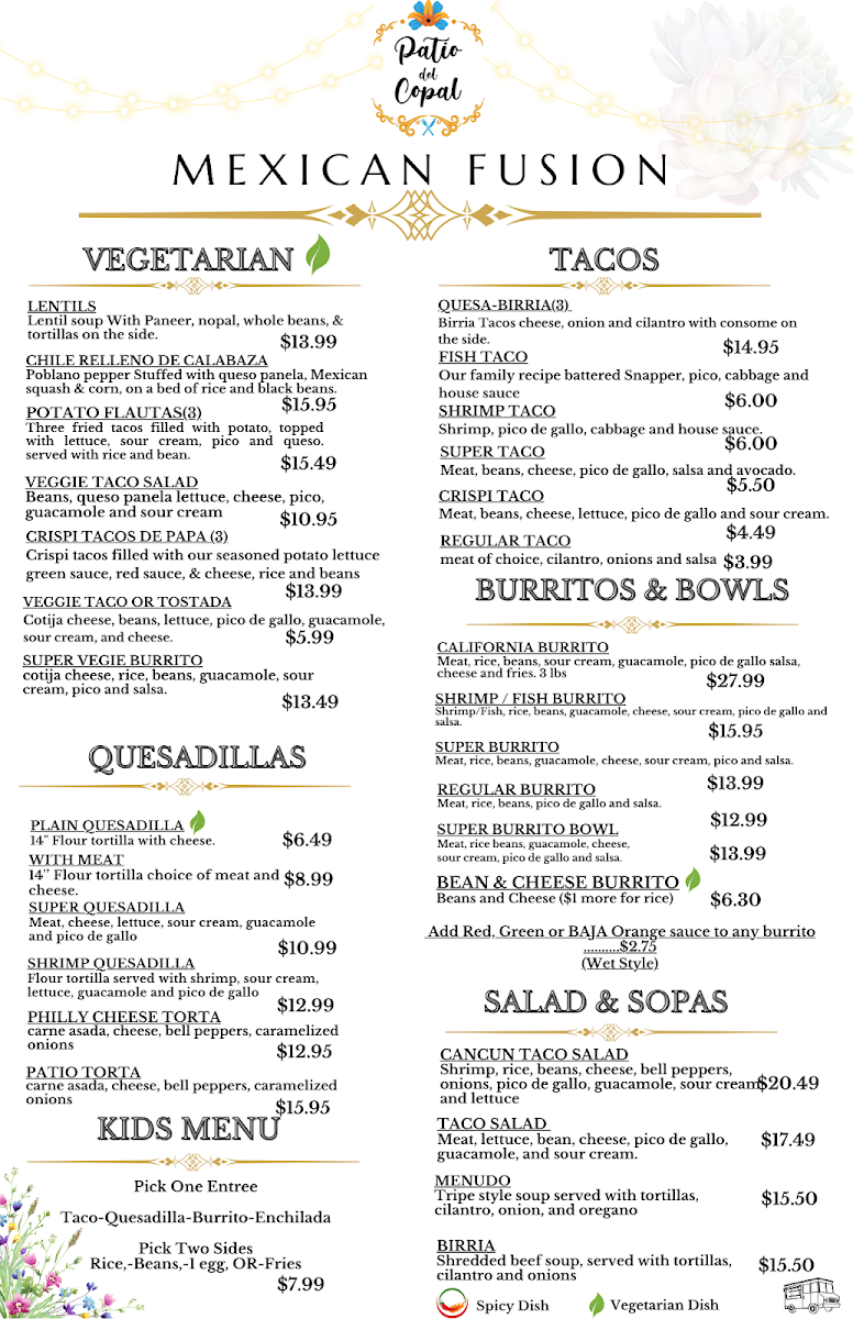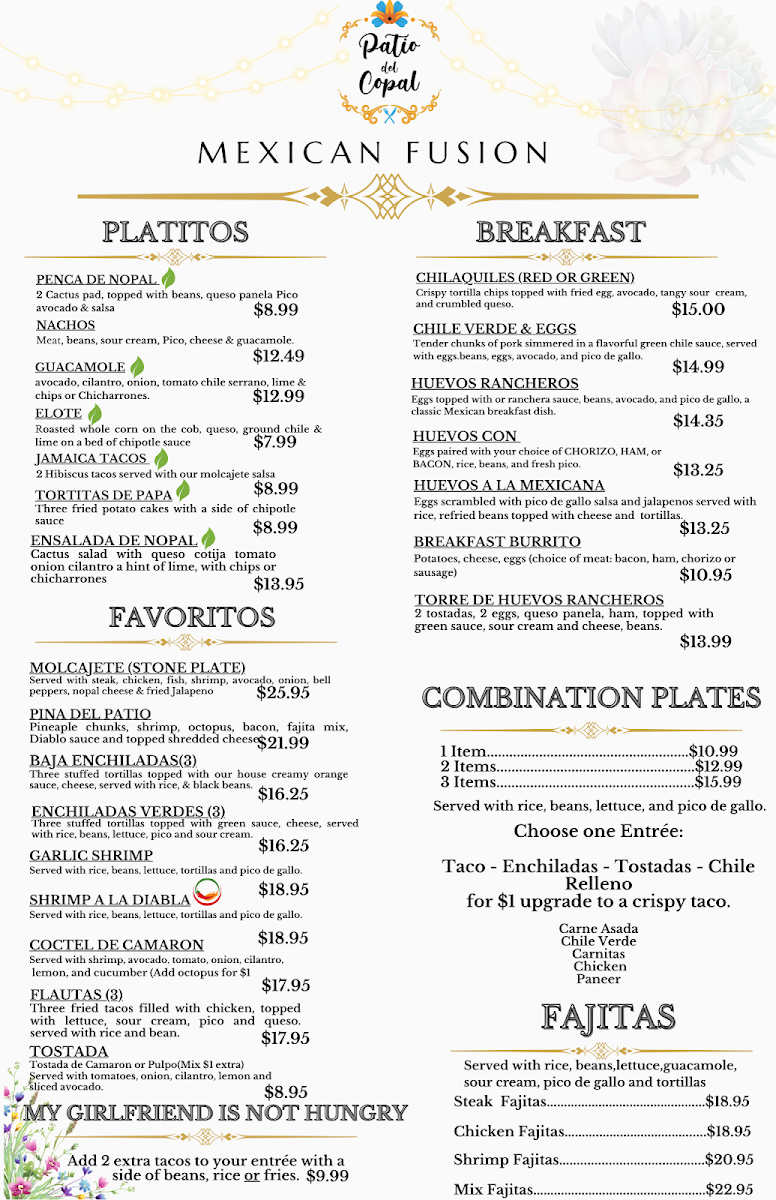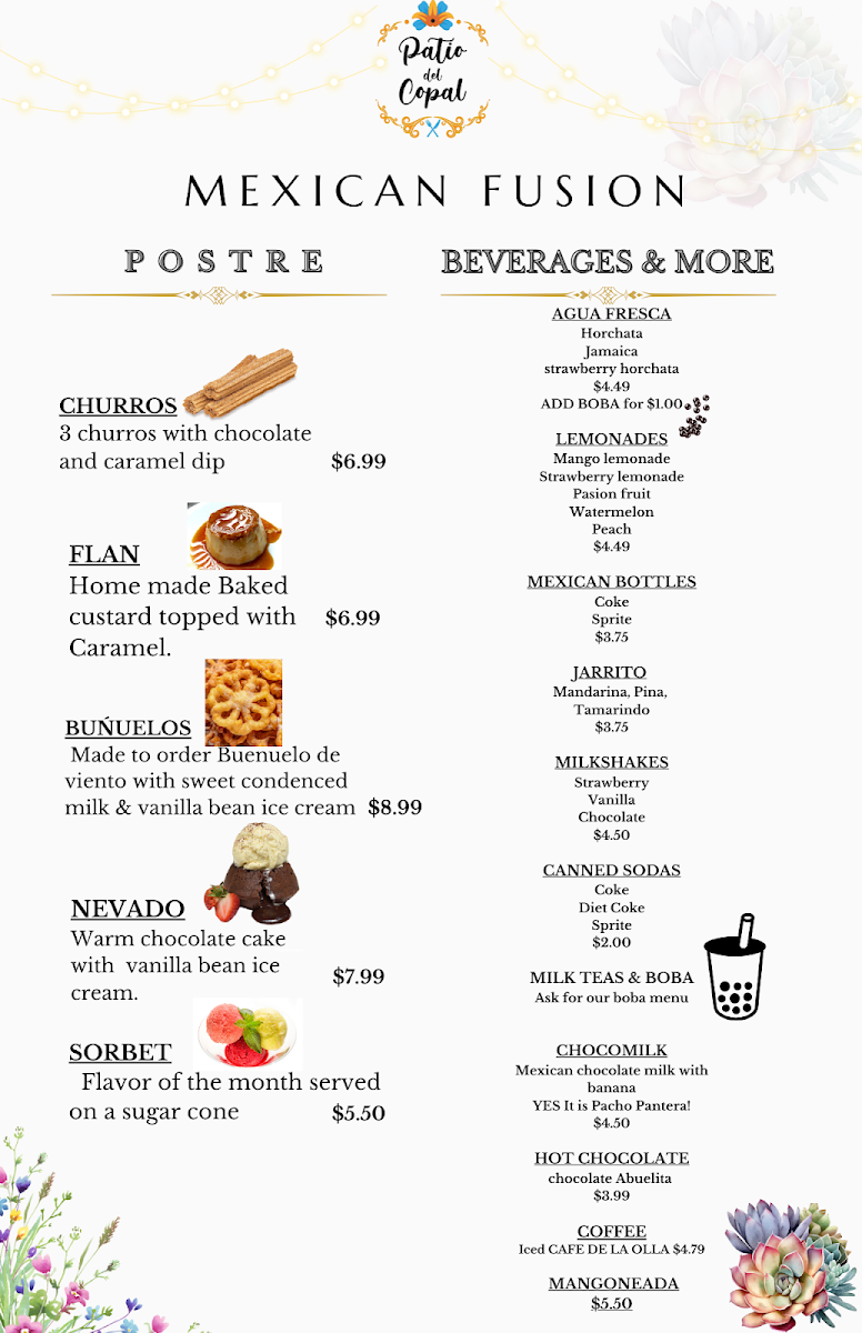 From a reviewer’s perspective, the menu at Patio Del Copal offers an impressively diverse selection that blends hearty Mexican classics with modern café favorites, making it easy to find something satisfying at any time of day. Breakfast standouts like Chilaquiles (Red Or Green) and Huevos Rancheros pair nicely with specialty drinks such as Cafe De Holla or Cuban Cortadito, while lighter options like Acai Bowl and Avocado Toast provide balance. Taco lovers can enjoy everything from a Regular Taco to a Shrimp Taco, and heartier appetites are well served by protein-packed dishes like Rib Eye 14 Oz or Steak & Grilled Shrimp On Skewers. The menu also shines with comfort items such as Chicken & Waffle, indulgent desserts like Churros and Flan, and creative plates like My Girlfriend Is Not Hungry. With additional variety in Super Quesadilla, California Burrito, Lemon Tilapia With Avocado Salsa, and refreshing drinks like Mocktails and Horchata Latte, the overall menu feels both extensive and thoughtfully curated, even though pricing details are not clearly listed.