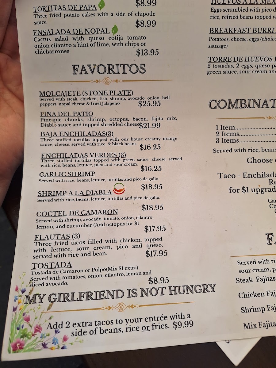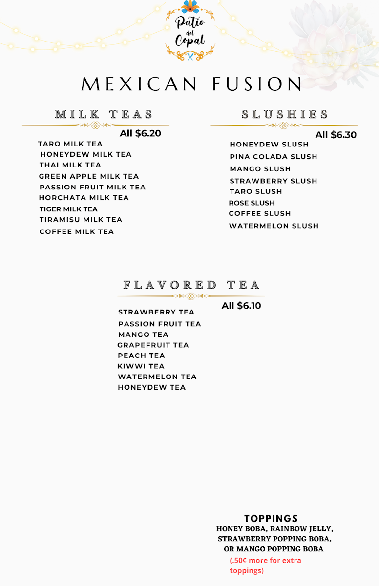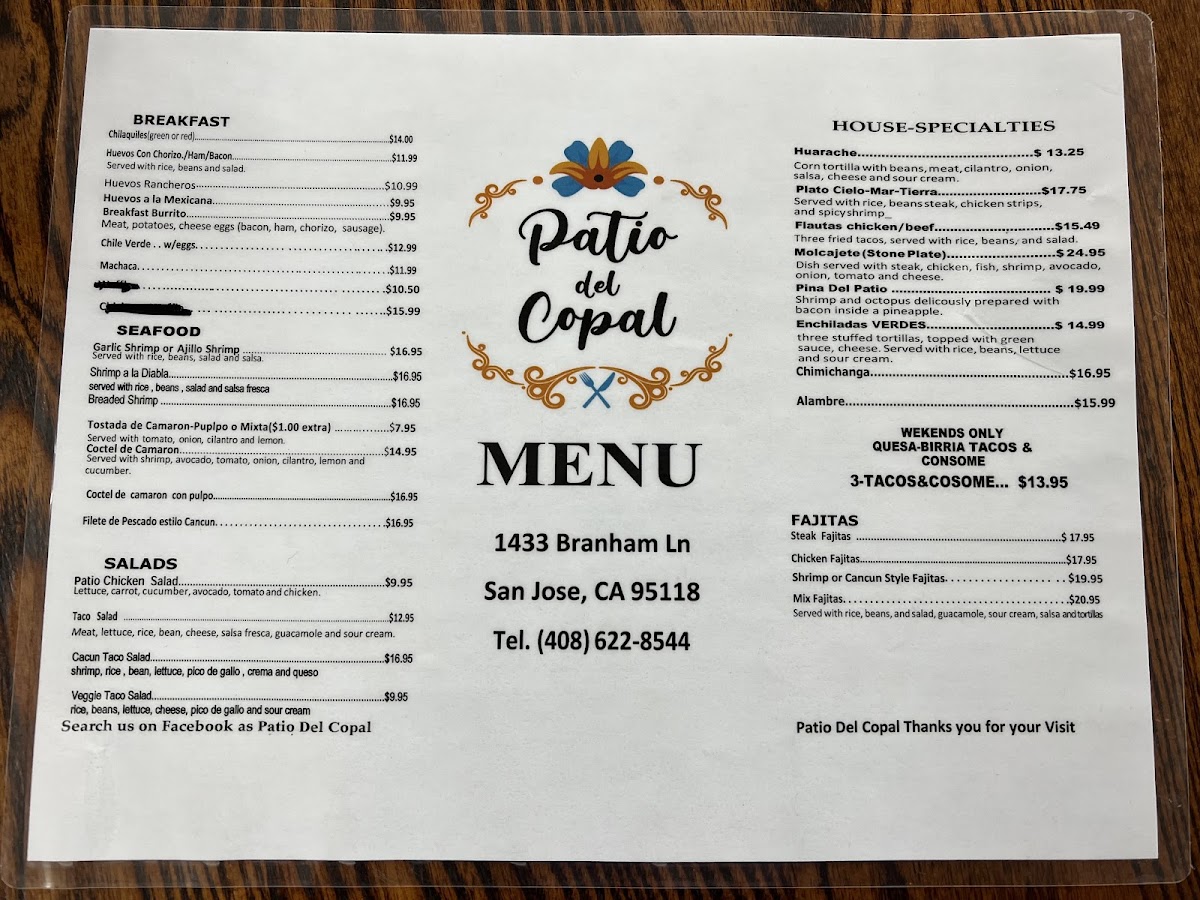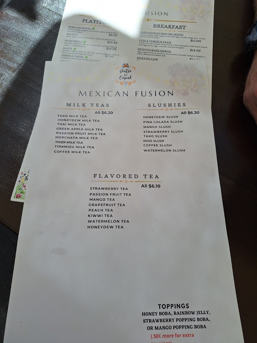 From a reviewer’s perspective, the menu at Patio Del Copal offers an impressively diverse selection that blends hearty Mexican classics with modern café favorites, making it easy to find something satisfying at any time of day. Breakfast standouts like Chilaquiles (Red Or Green) and Huevos Rancheros pair nicely with specialty drinks such as Cafe De Holla or Cuban Cortadito, while lighter options like Acai Bowl and Avocado Toast provide balance. Taco lovers can enjoy everything from a Regular Taco to a Shrimp Taco, and heartier appetites are well served by protein-packed dishes like Rib Eye 14 Oz or Steak & Grilled Shrimp On Skewers. The menu also shines with comfort items such as Chicken & Waffle, indulgent desserts like Churros and Flan, and creative plates like My Girlfriend Is Not Hungry. With additional variety in Super Quesadilla, California Burrito, Lemon Tilapia With Avocado Salsa, and refreshing drinks like Mocktails and Horchata Latte, the overall menu feels both extensive and thoughtfully curated, even though pricing details are not clearly listed.